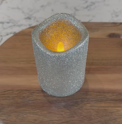 A luxury flameless candle that catches light so beautifully, and sparkles with a glittery finish. When turned on, it glows a soft yellow/orange and flickers slightly - to mimic a real candle flame.
